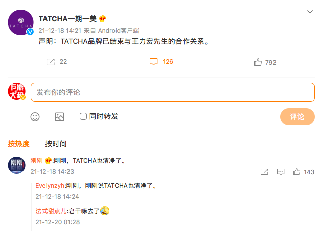 稍微一查,原来,王力宏本来就没什么代言了,尤其是这两年,都是些不知名的五线品牌,其中有一个叫品牌TATCHA,也宣布没有合作关系了,可惜没赶上第一波……
