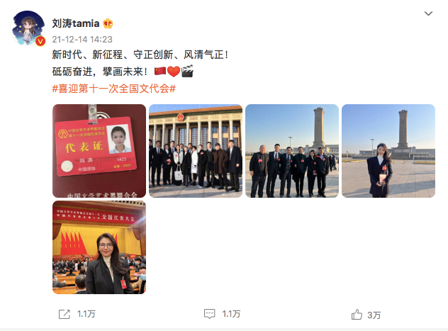 你可千万别以为,这会都是作家、导演出席,与“明星”无关。会后,@刘涛 在其微博晒出了代表证,以及与其他文艺工作者的合影。