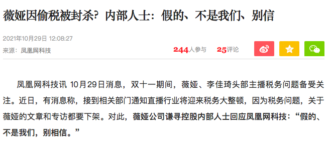 其实早在今年10月29日,也就是近2个月前,就有“薇娅涉及税收问题被媒体封杀”的传言出来: