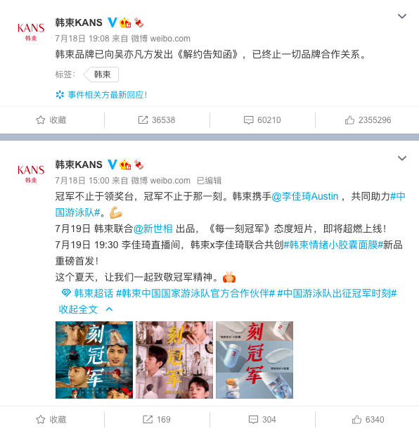 我们换一个视角,品牌解约明星,现在变成了一个技术活。从韩束解约吴亦凡,到英菲尼迪解约王力宏,背后都有不少故事以及基于事实的决策逻辑。