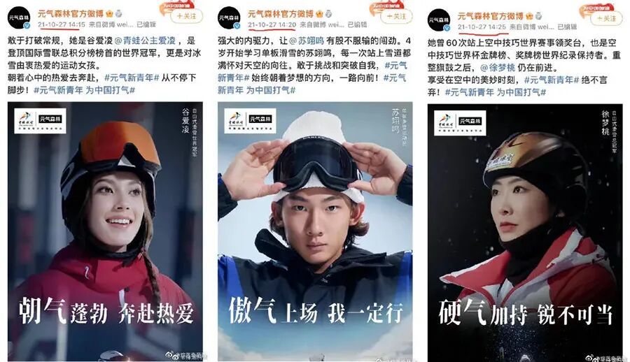 3、我看到,元气先是在2021年9月28日的官宣了谷爱凌的代言,又在一个月后官宣了三位冰雪代言人(增加了苏翊鸣、徐梦桃),从1个人变3个人,这背后有什么故事以及策略吗? 我相信,在当时选择这三位代言人时,你们应该面对的选择不少,为什么是分别选择这三位?我很想知道,你们有依靠数据分析类的工具吗?感性(品牌调性)和理性(运动成绩),是如何结合的?