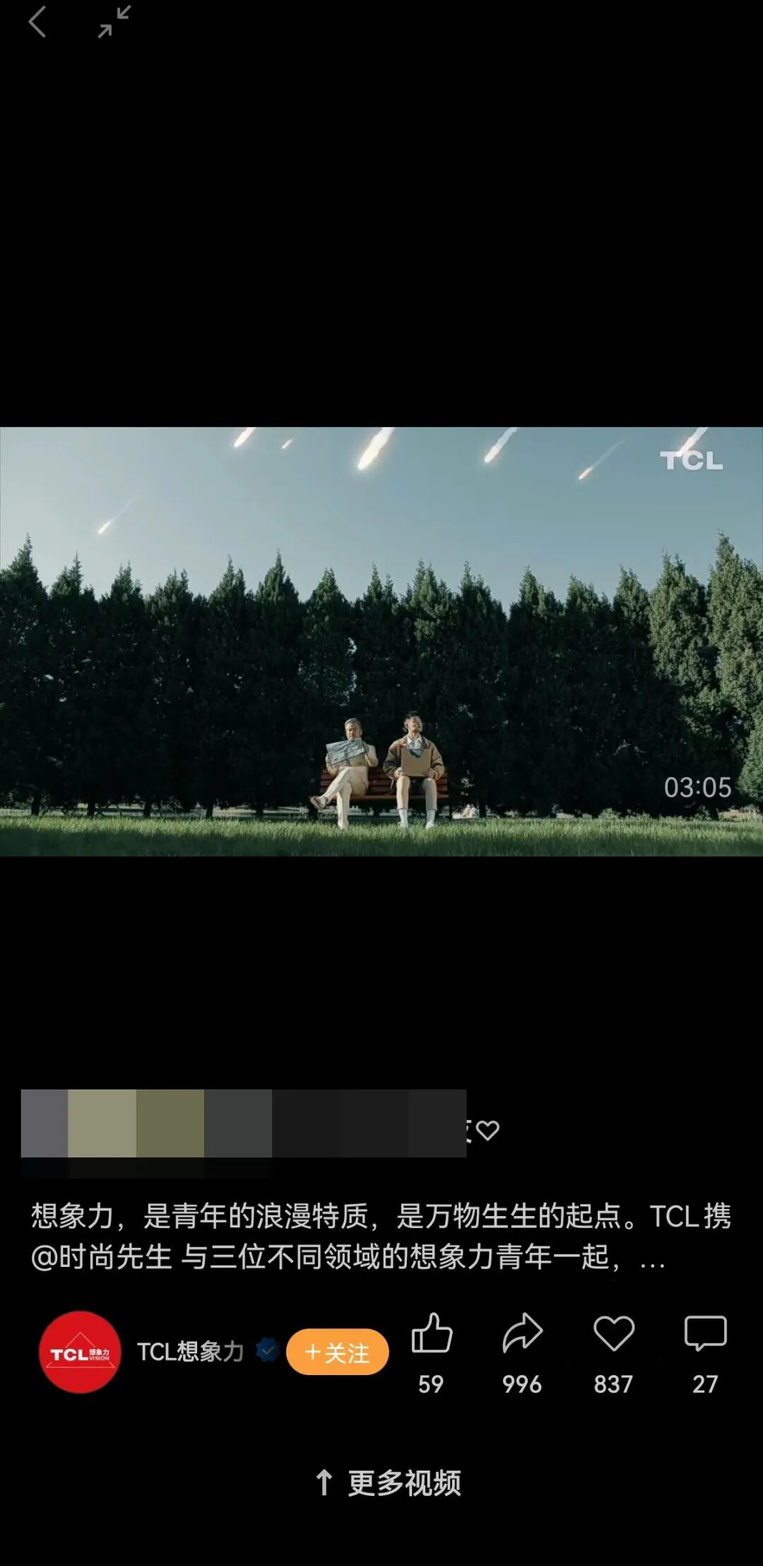 TCL没有和主流媒体合作,反而找到时尚先生,鼓励年轻人发挥想象力,完全是品牌侧的理念传递,大叔看到,“TCL想象力”是其刚刚注册的一个视频号,其官方定位显示是“TCL品牌科技人文IP”。