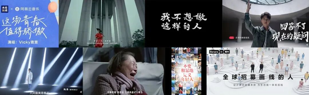 B站《我不想做这样的人》、知乎《重逢》、小红书《走着瞧》、快手《不要粗暴地定义年轻人》、高途《路人》、京东《新少年说》、蕉内《底线》、网易云音乐《这场青春值得骄傲》。