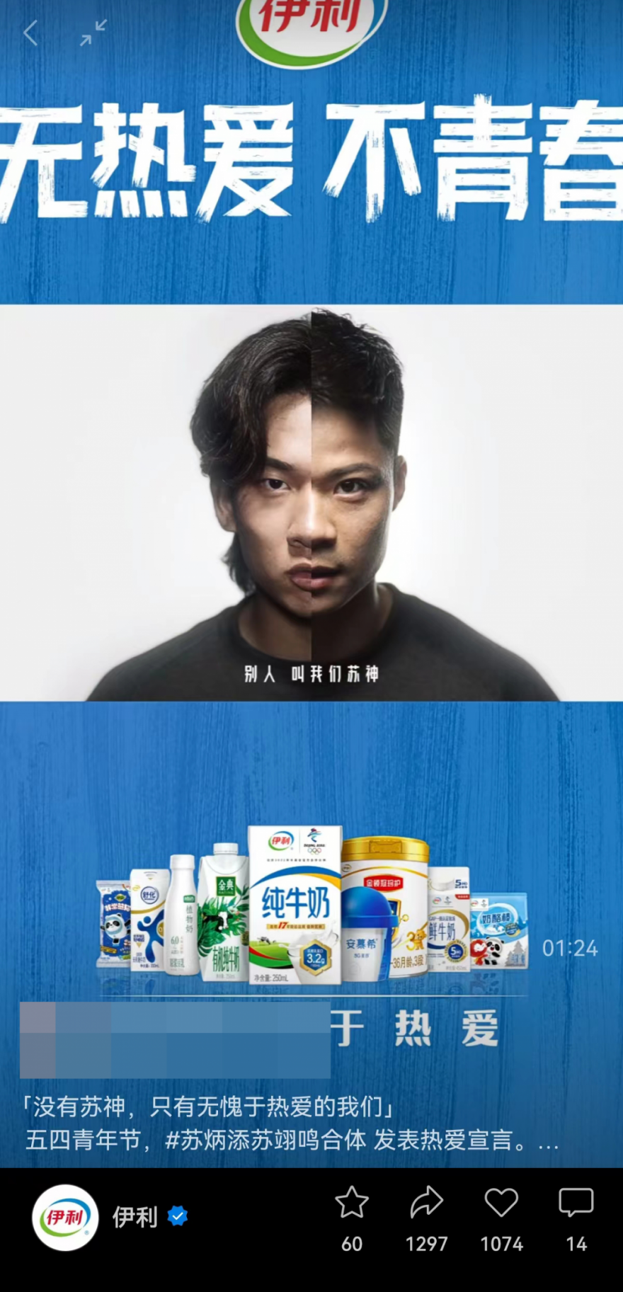 B站《不被大风吹倒》、快手《青春十万米》、伊利《苏神》、飞鹤奶粉《奋斗者!正青春》、匹克《脑动》、金典《人间》、TCL《想象力》、网易云音乐《敢于》、京东《何为青春》……