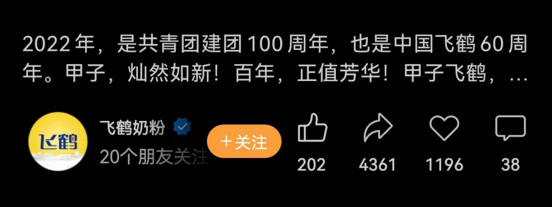 这两句文案其实也做了植入,一对比飞鹤自己的发的文案,就看出来了,还非要强调飞鹤成立60年了……