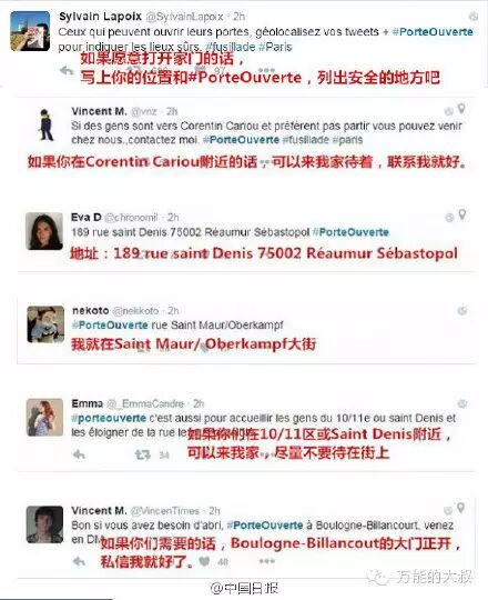 恐怖袭击发生后,巴黎人在Twitter上发起了一场#porteouverte(开门)运动,呼吁人们对滞留在街头、惊魂未定的陌生人打开家门。很快就有人响应这一运动,列出自己的地址,表示愿意收留陌生人。