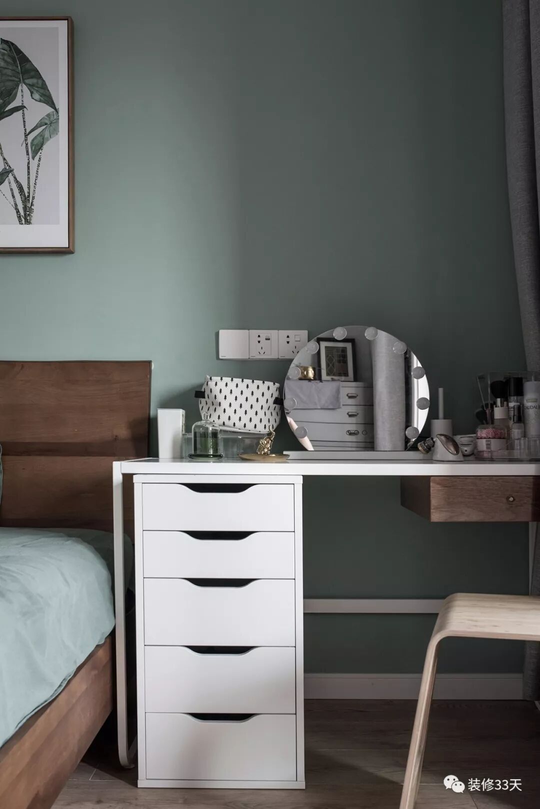 ▲ 主卧,灰绿色床背景点缀装饰画,搭配木色大床与灰绿色床品,清简雅致