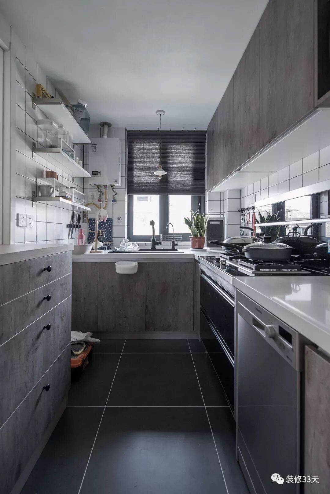 ▲ 厨房深色地面搭配小白砖墙面,木纹橱柜搭配白色层板,呈现经典北欧料理区
