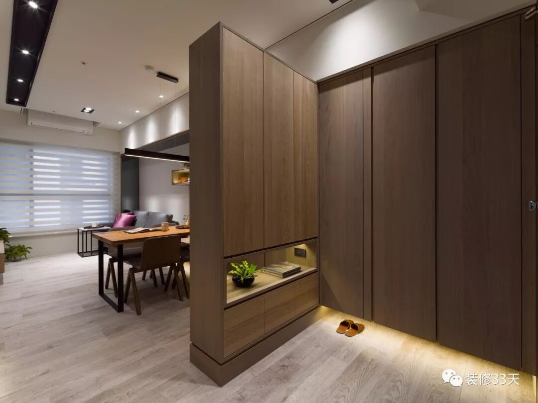 ▲ 建筑面积75平,使用面积60平,玄关木色系统柜规划旋转式鞋柜,满足分门别类的收纳需求