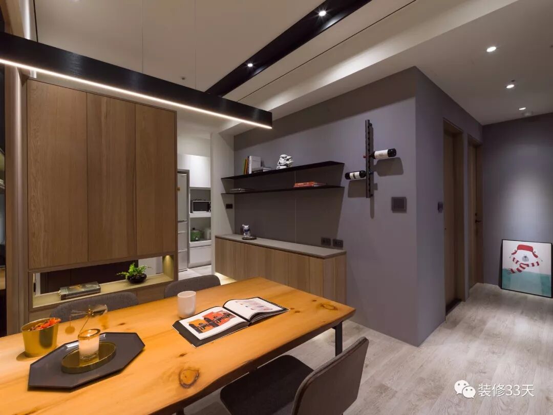 ▲ 客厅望向餐厨区域,极简顶面嵌入黑色线条,灰色立面规划红酒架,电视墙以书本为层架皆是空间小趣味
