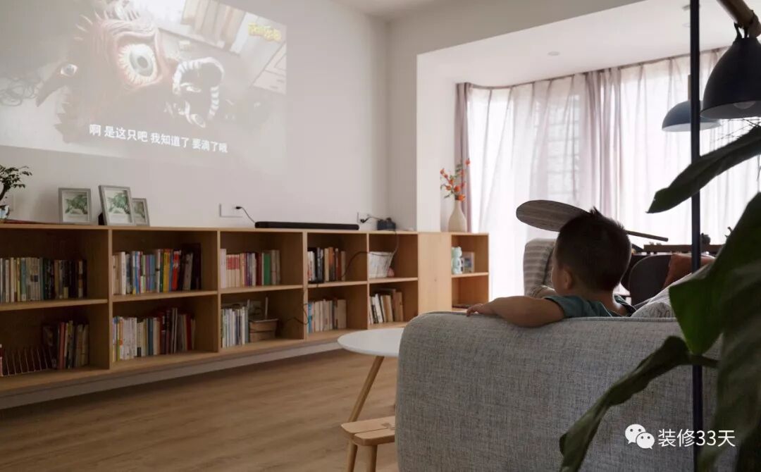 ▲ 取消传统电视背景,用投影设备取代,加长架空式矮柜作书柜使用,并不留清扫死角
