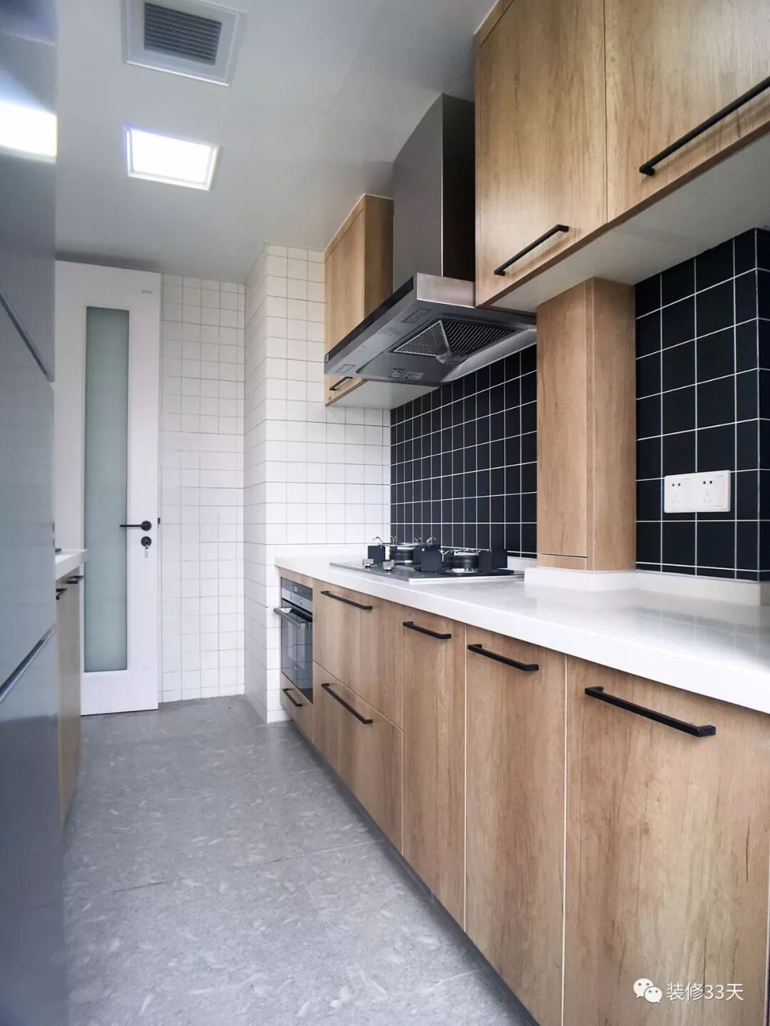▲ 重新规划厨房与生活阳台的比例,扩大厨房实用面积,墙面铺设300*600规格瓷砖,黑白撞色搭配木色柜门