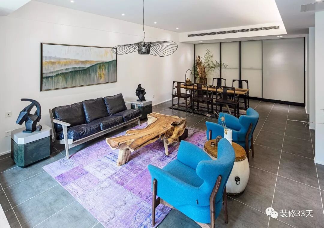 ▲ 孔雀蓝座椅中间摆放一面白色鼓凳,让中西碰撞与交融