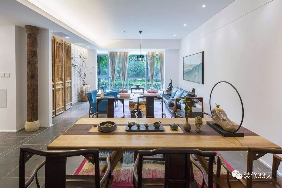 ▲ 餐厅整面白色屏风墨色包边,前面摆放一棵枯树,插上嫩绿枝条,映衬着屏风俨然成了一幅水墨丹青