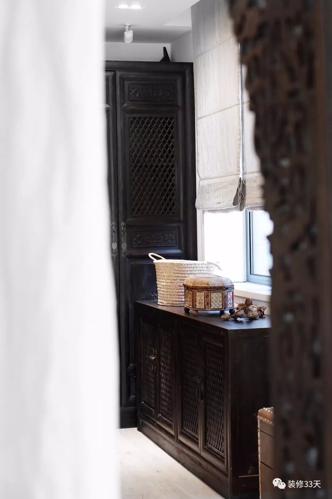 ▲ 卧室陈设简约,衣柜柜门选用做旧的雕花木门,显得端庄典雅