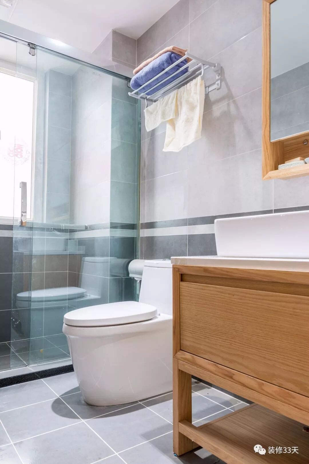 ▲ 客卫采用深浅灰色地砖铺贴,搭配白色美缝,原木质地的成品台盆柜与镜柜,简约实用