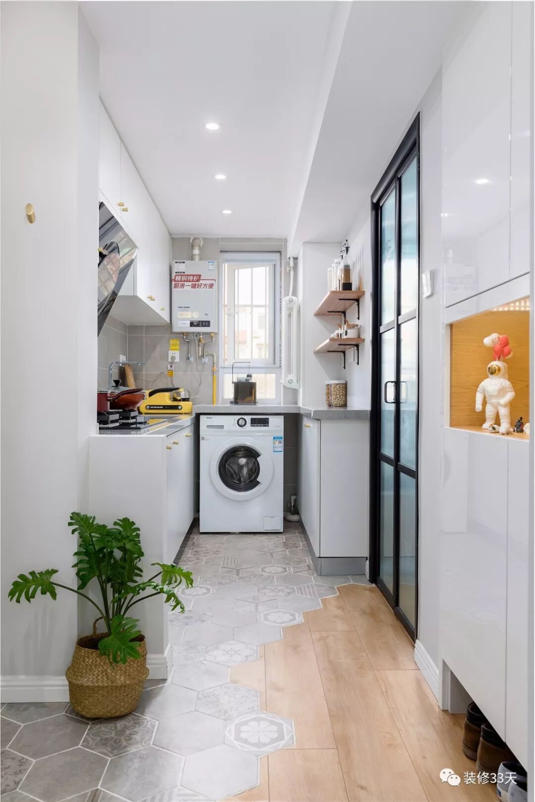 ▲ 灰色六角砖与木地板拼接,区分厨房与玄关、书房三个区域