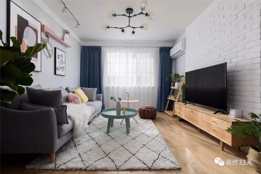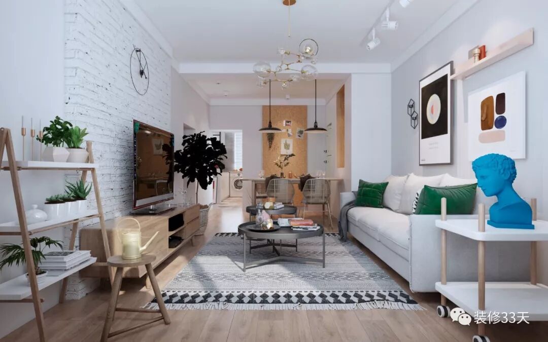 ▲ 用网红分子灯搭配轨道射灯,白色文化砖砌起电视背景墙,各类流行元素装点整个客厅