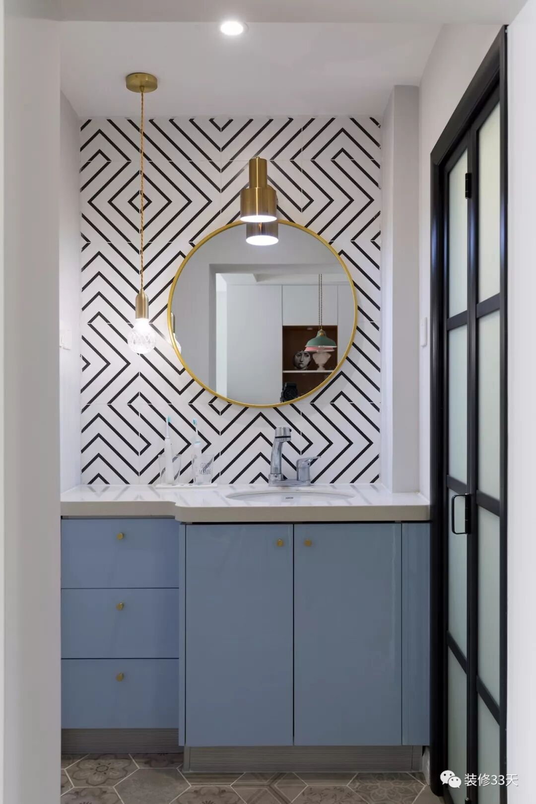 ▲ 卫生间干湿分区,条纹花砖铺贴背景结合蓝色柜门,清新又时尚,金色元素圆镜与错落灯饰提升精致度