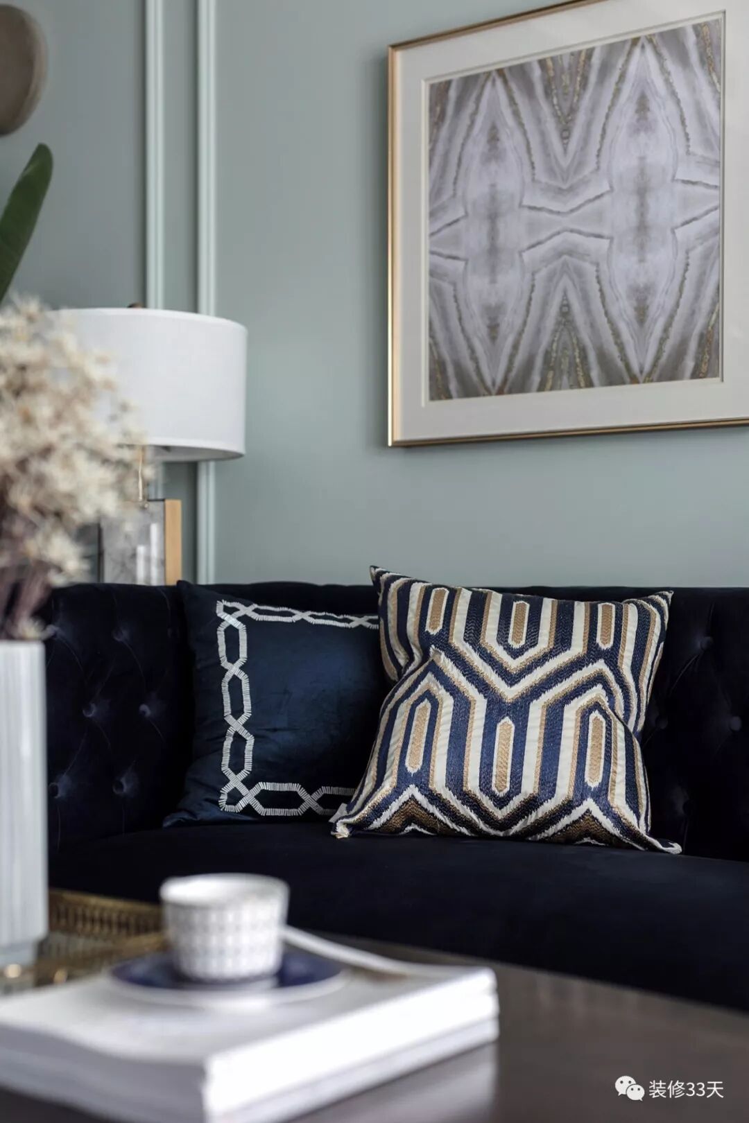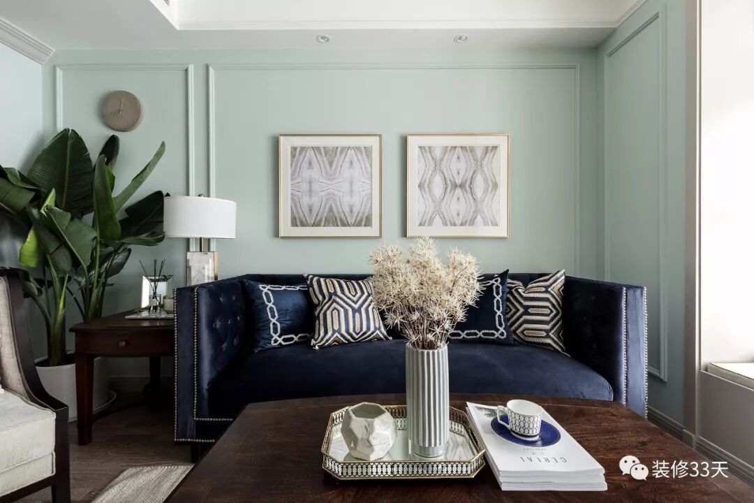 ▲ 靛蓝色丝绒铆钉沙发,搭配浅浅草色背景墙,通过简单的石膏线条勾勒休闲美式的居家格调