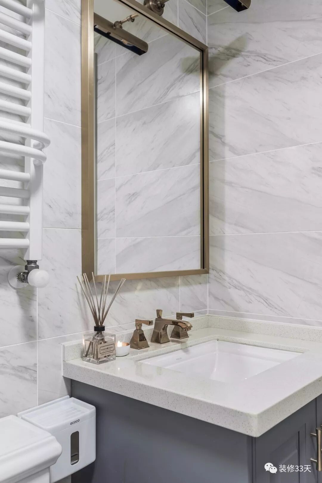 ▲ 卫生间通过整铺白色石纹瓷砖,扩大视觉空间感,蓝灰色台盆柜与金色元素点缀空间