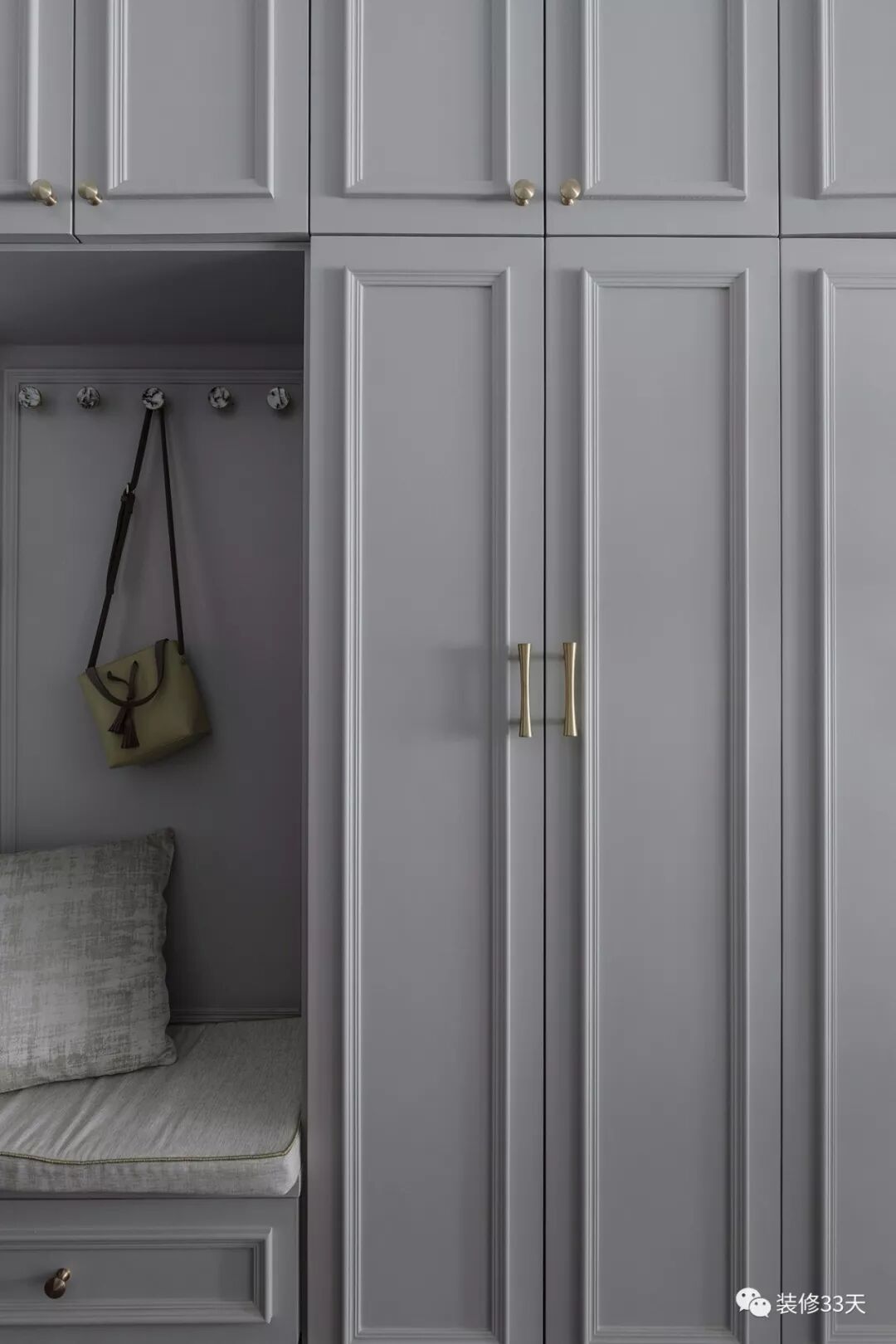 ▲ 使用面积81平,入户左侧打造灰色储物柜,兼具鞋柜、换鞋凳、衣帽钩的功能