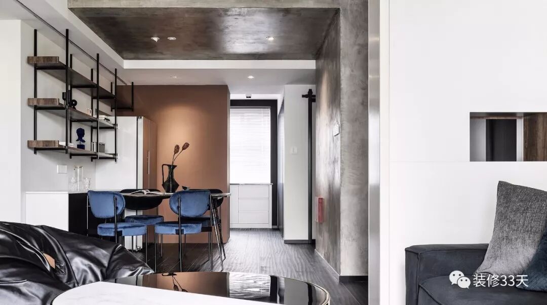 ▲ 层高有限,打造墙顶延伸视觉,配色以黑白灰为主基调,揉合红色系和宝蓝来让氛围显得活泼又不失优雅