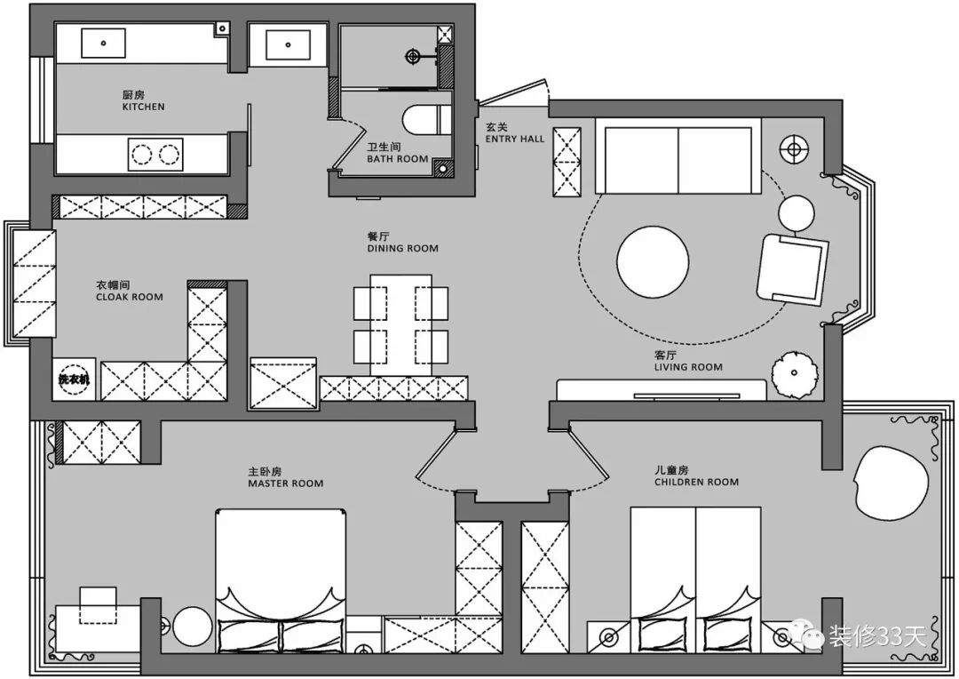 ▲ 将原客房改成衣帽间,通过餐厅墙体延伸至衣帽间,使得空间之间有了互动性