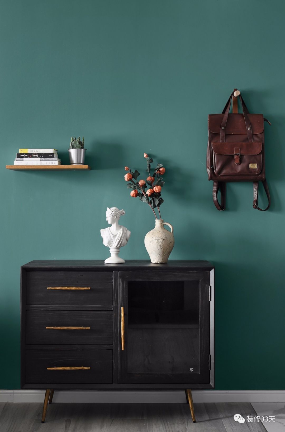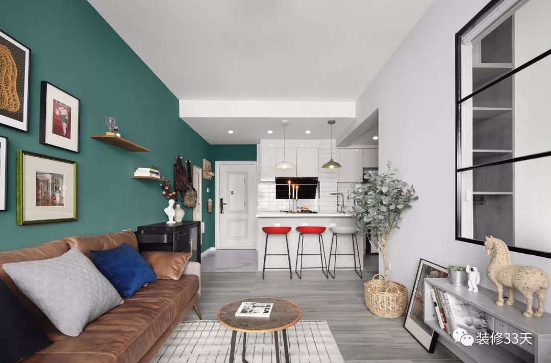▲ 建筑面积47平,总造价25万,祖母绿背景搭配深灰色玄关柜,气质复古