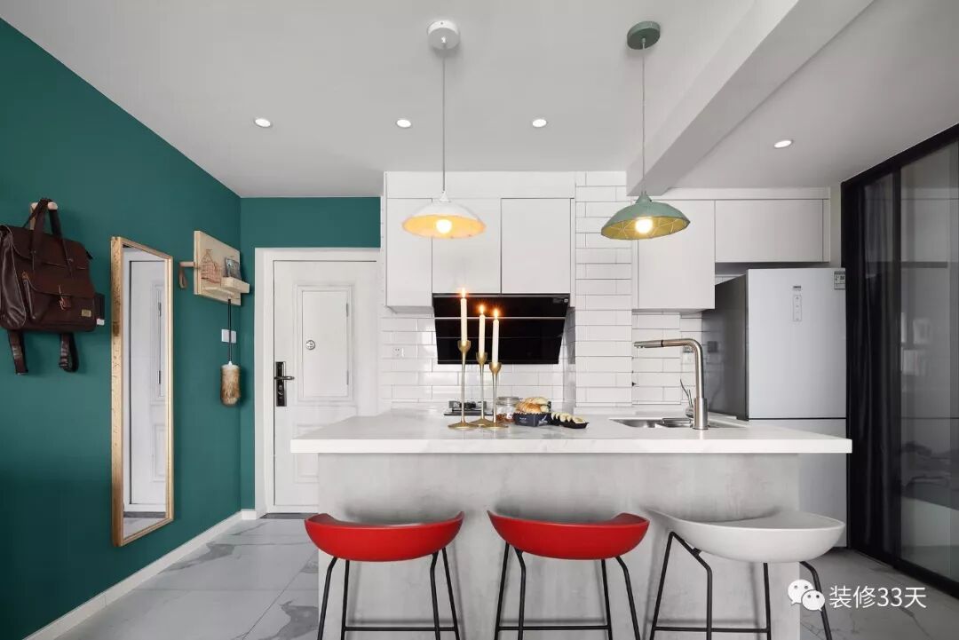 ▲ 工字铺白色瓷砖与祖母绿背景协调搭配,吧台上方的吊灯让空间更有层次感