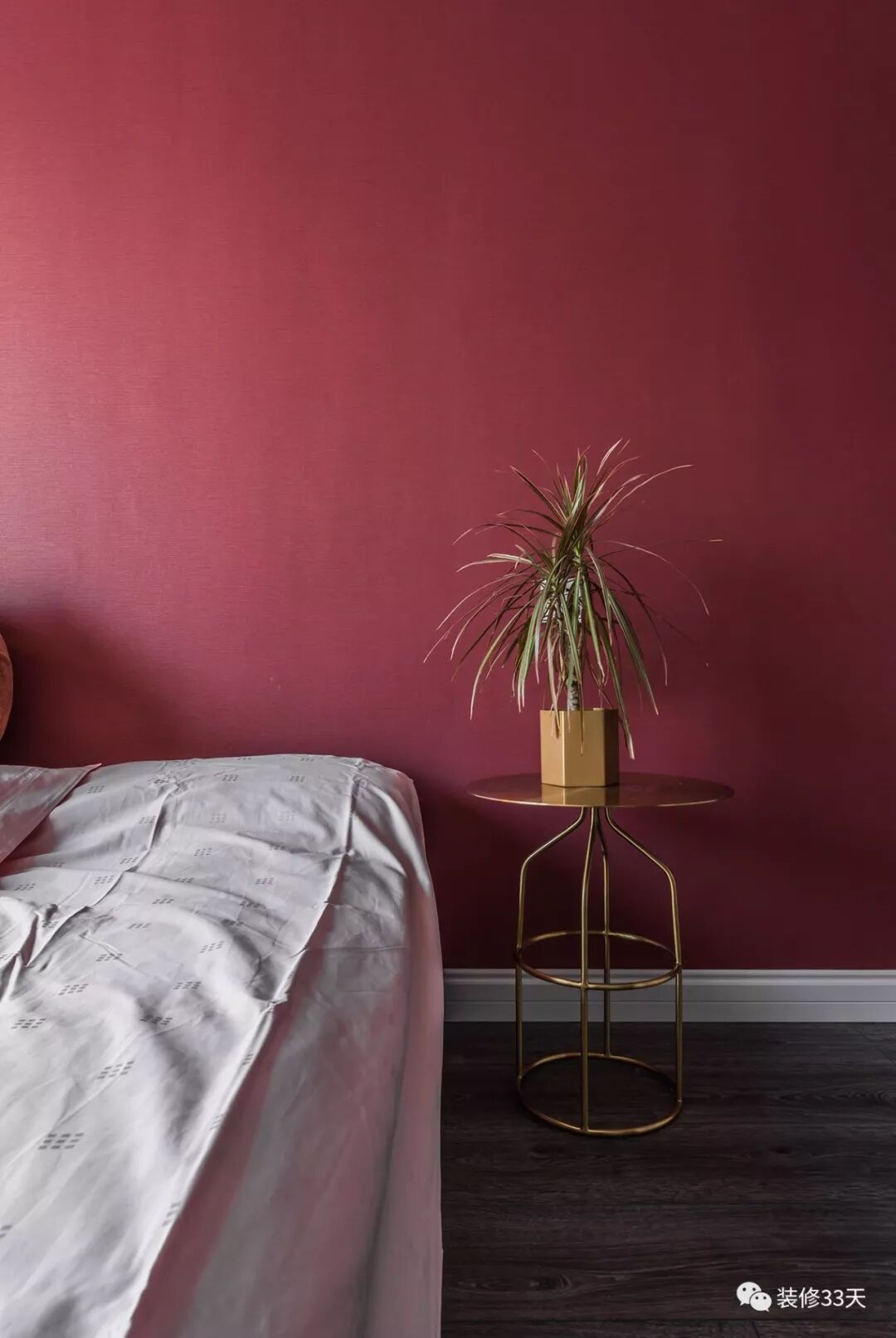 ▲ 主卧,纯白和酒红的墙面,高级的撞色,热情和冷静结合得很妙