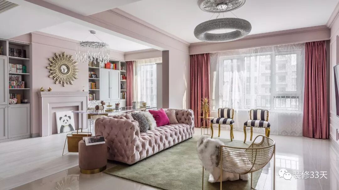 ▲ 客厅选用高级灰粉作为空间主色调,在家具和墙壁,窗帘等地方选用不同灰度的粉,使空间色调具有层次感