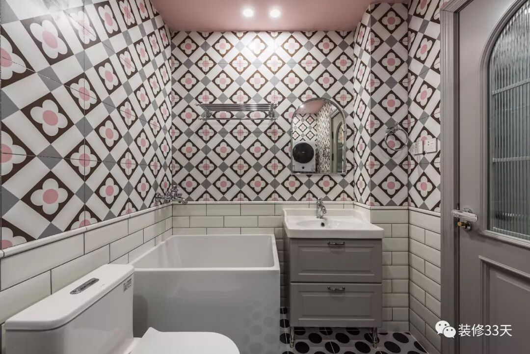 ▲ 卫生间,复古粉色墙砖、波点地砖,其实砖缝也是银色的细节,都是复古华丽的范儿
