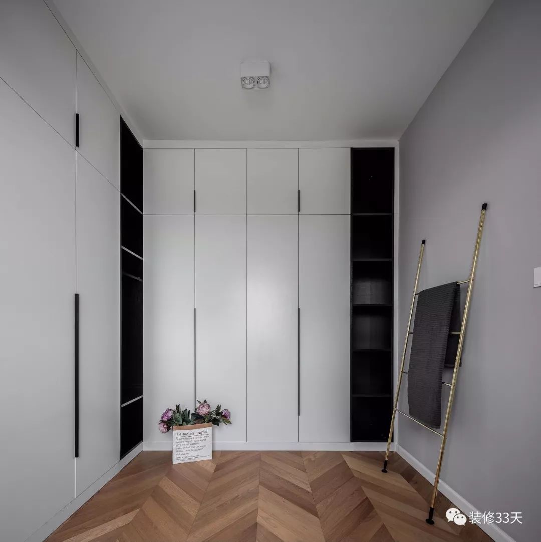 ▲ 主卧衣帽间,L型置顶柜体,白色柜门中嵌入开放式黑色层板柜,黑白灰低饱和简约时尚感