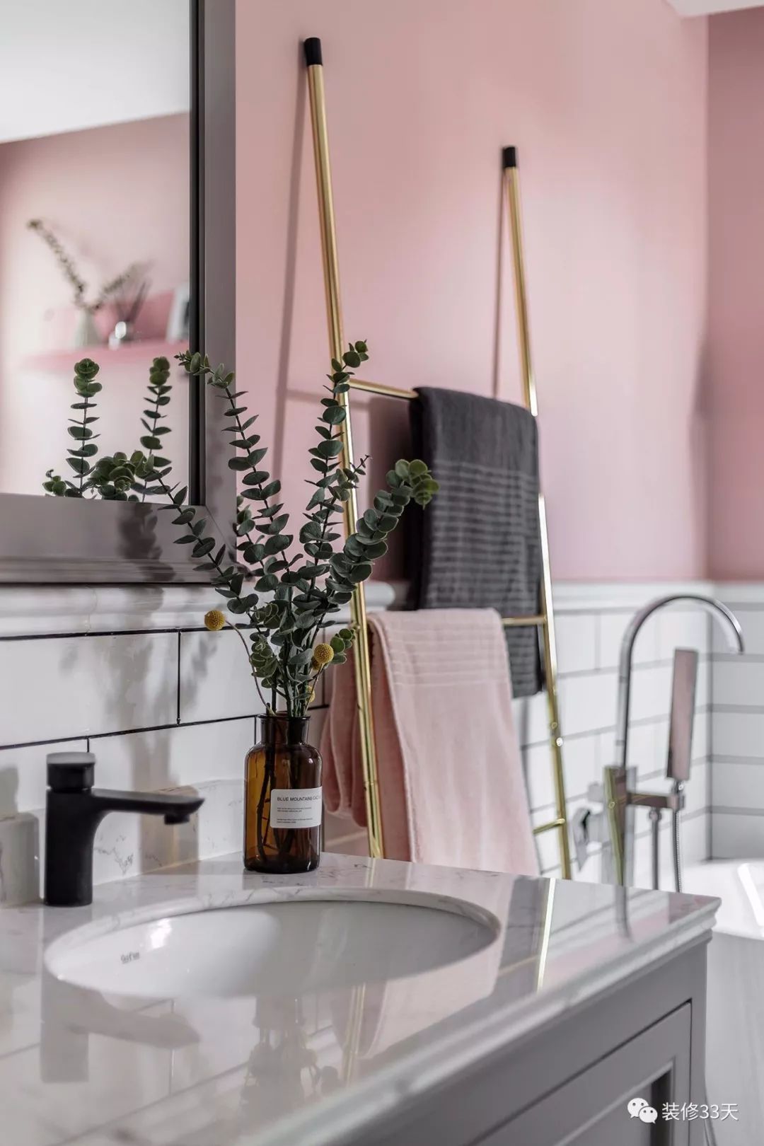 ▲ 灰粉色点缀金色元素,卧室之间有着色调与材质上的联系
