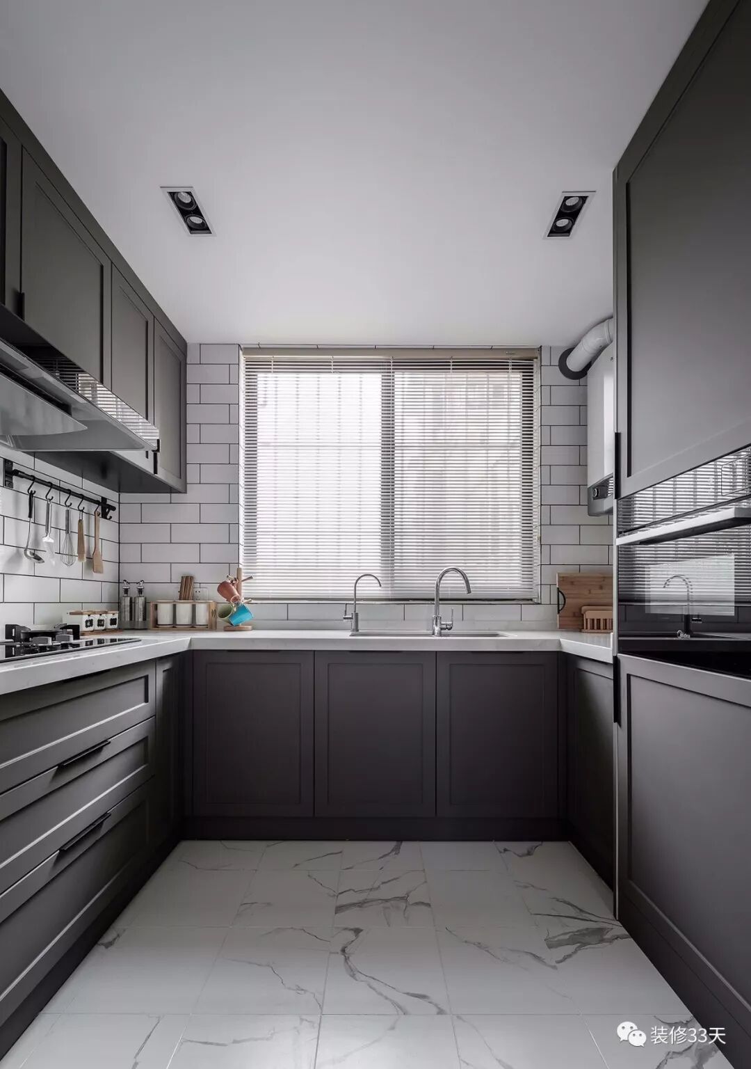 ▲ 对餐厨区重新规划后,打造U型厨房,细腻的灰色柜门搭配白色瓷砖,地柜延伸高柜嵌入大型厨电