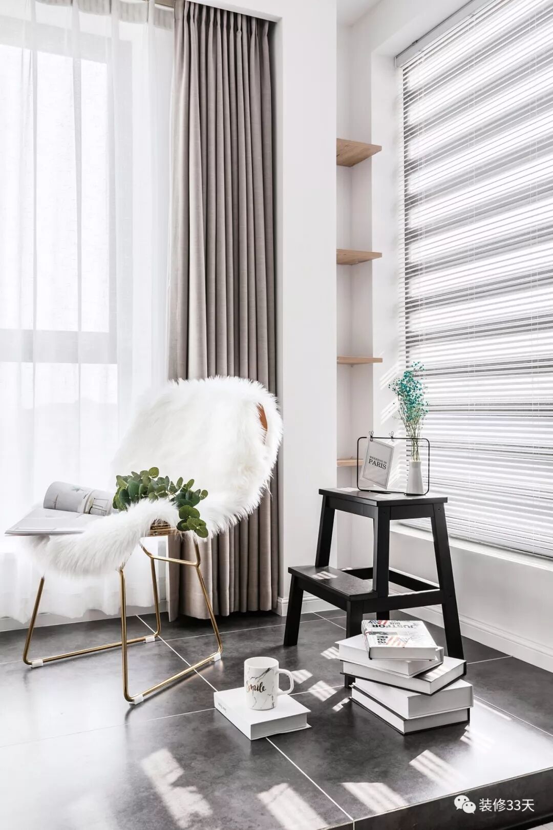 ▲ 透过窗户,阳光倾洒入室,深灰色地砖、灰白色木地板完美承接大自然的过渡,打通阳台与客厅的好处,增大采光,也开阔视野