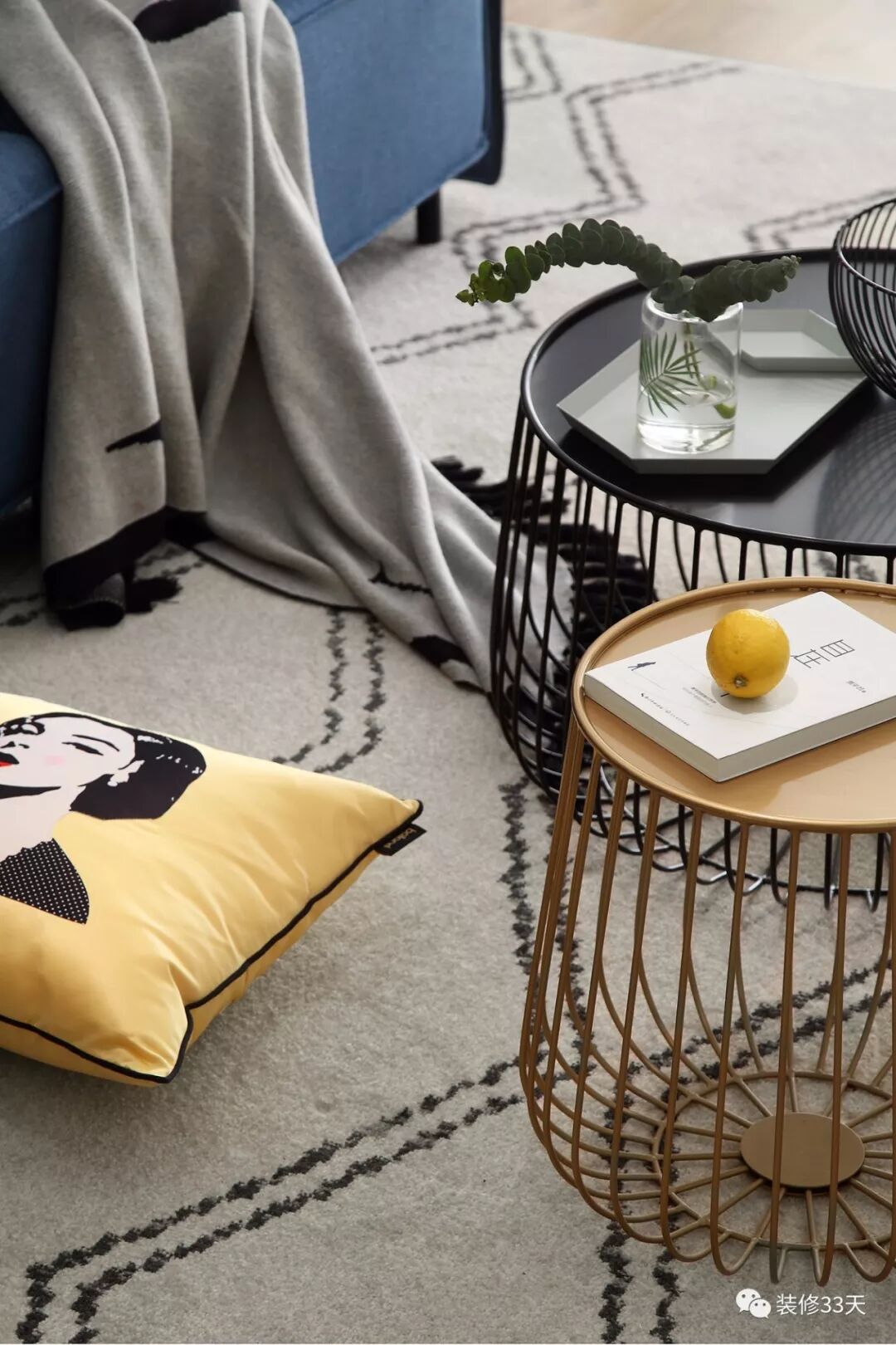 ▲ 柔软的地毯放上金色与黑色的铁件镂空茶几,点缀绿植,呈现小清新的格调