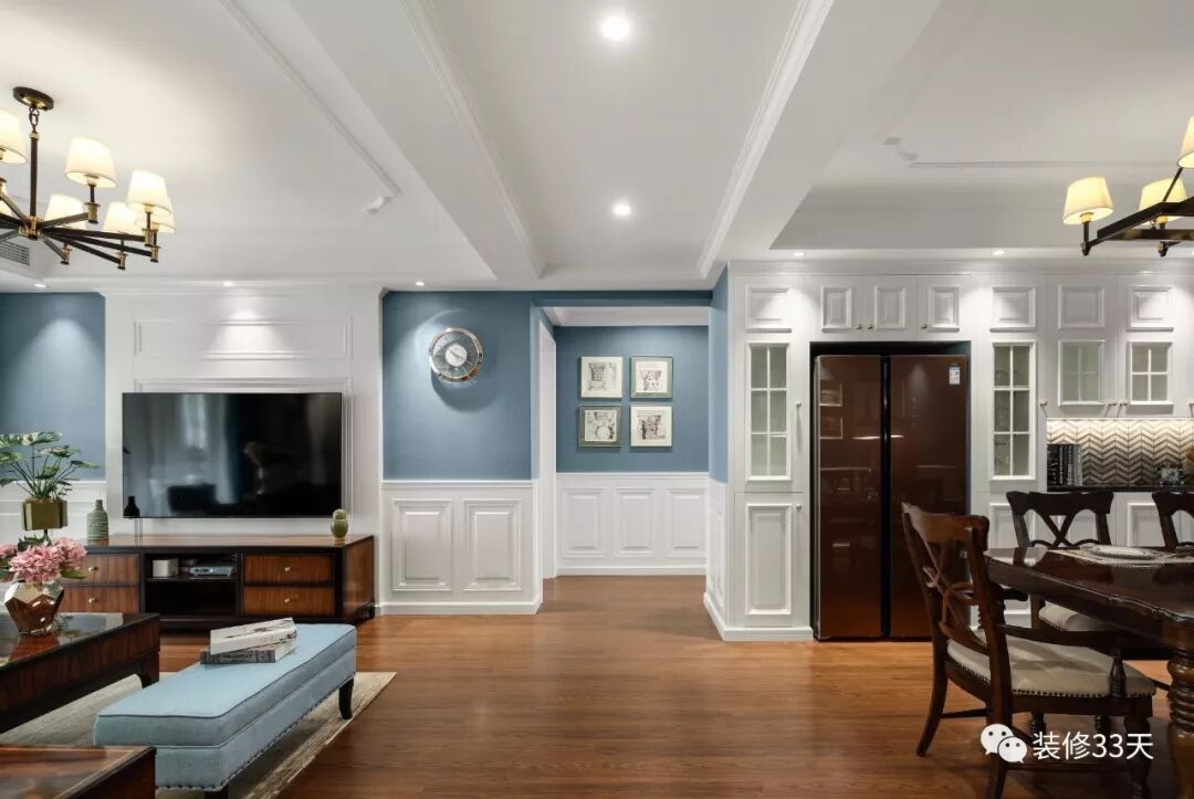 ▲ 餐厅整体延续蓝白基调,护墙造型与柜门造型呼应,拆除原始轻墙体,依着承重墙做嵌入式柜体设计,纳入冰箱解放厨房空间