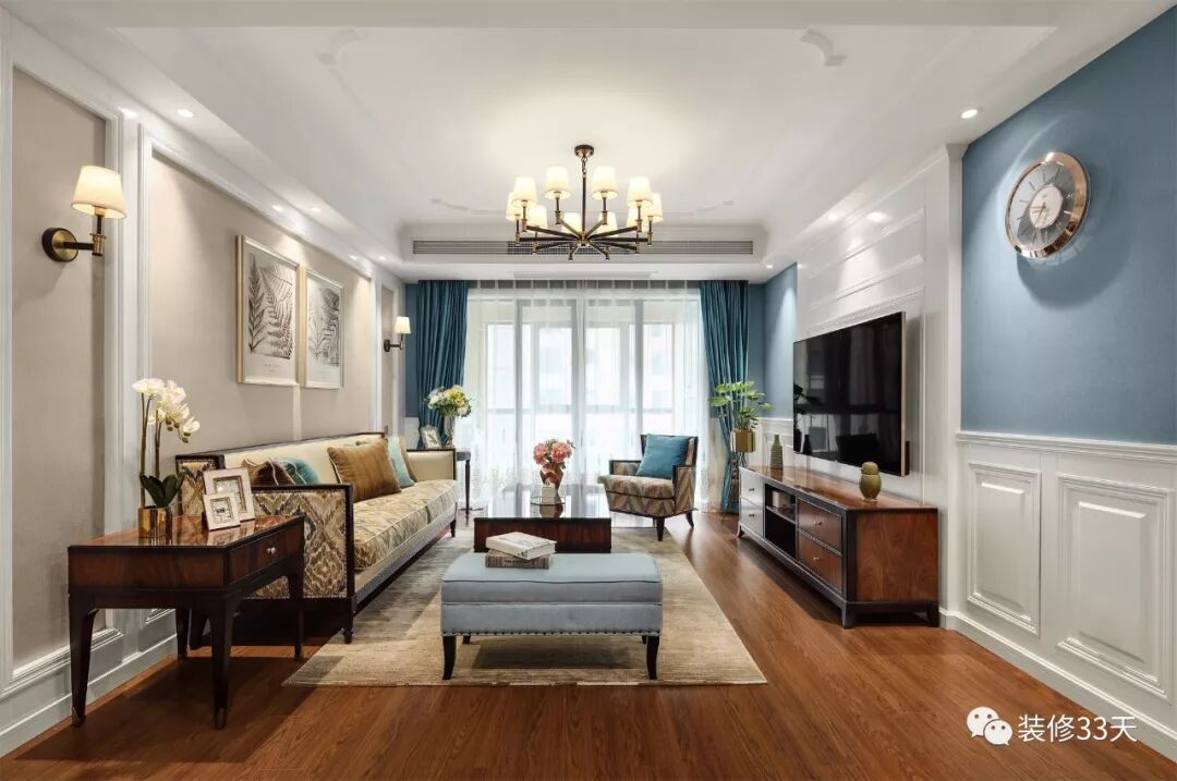 ▲ 客厅整体空间以柔和米色,蓝色打底,搭配复古的棕,营造柔软,温润的传统美式风格