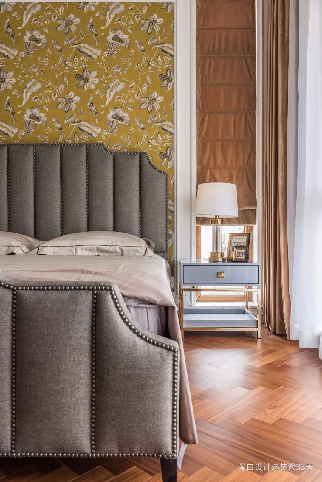 ▲ 老人房采用沉稳的大地色系,人字铺木地板搭配定制的进口壁纸,复古艺术吊灯提升空间颜值