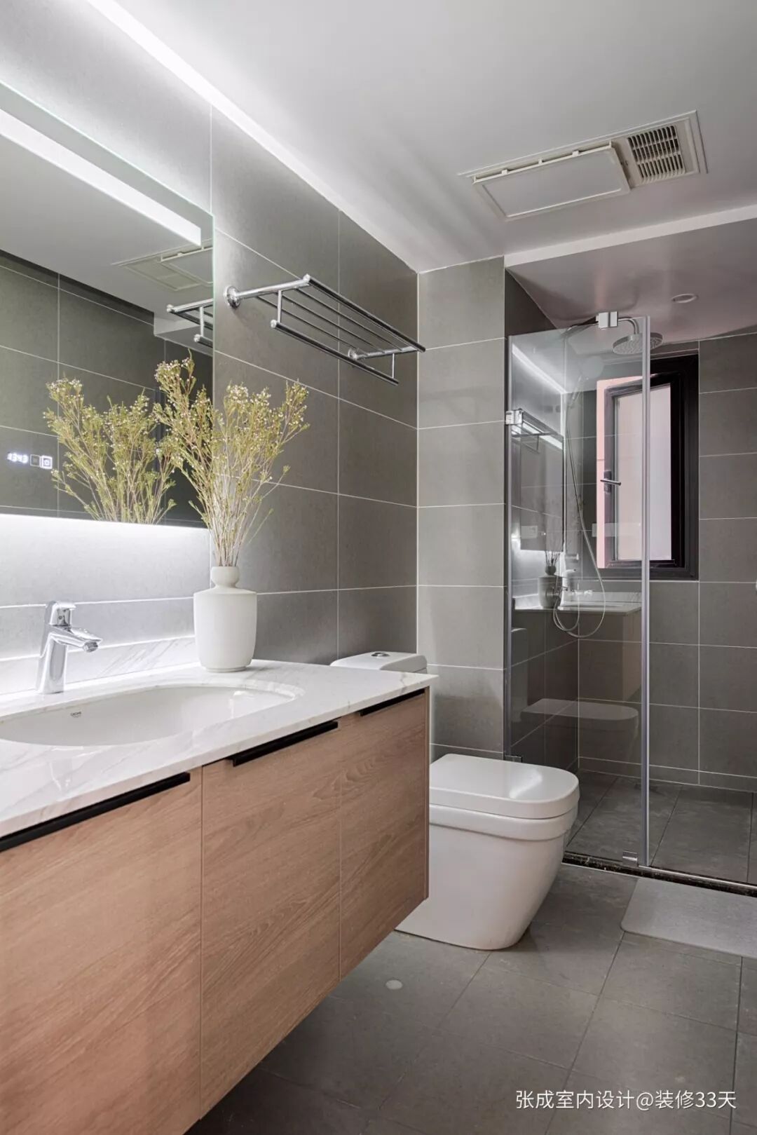 ▲ 客卫,整体通铺哑光灰色瓷砖加白色美缝,木色台下盆的洗手台在隐形光源下显得更为高级