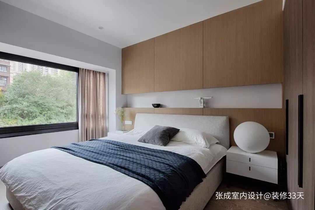 ▲ 次卧,木色由地面延伸至木质柜门,再到床头顶面的层次设计,搭配大面积留白与灰色系棉麻软装,结合窗外绿景,打造素雅简洁的就寝环境