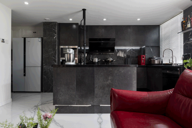 ▲ 黑色的石英石台面,黑色磨砂材质的柜板,黑色的大理石纹样瓷砖贴在墙面,连刀具厨具、插座开关都是黑色,红色米箱提亮色调