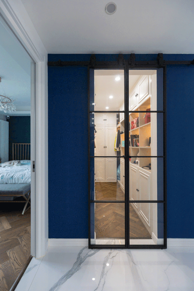 ▲ 主卧划分出独立的衣帽间,开门采用黑框玻璃轨道门,与蓝色墙面搭配,简洁耐看