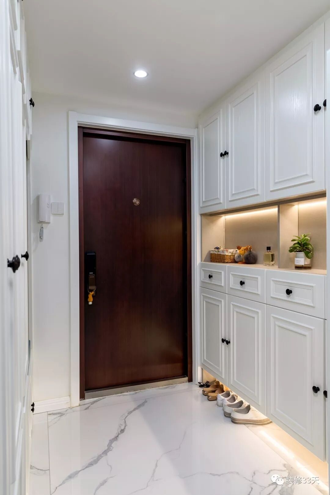▲ 建筑面积90平,半包8.1万(轻工辅料+水电),现居住90后小夫妻+猫两只,门厅两侧做收纳柜,左侧柜体中部留空,随手置物,底部架空15cm,用来放鞋