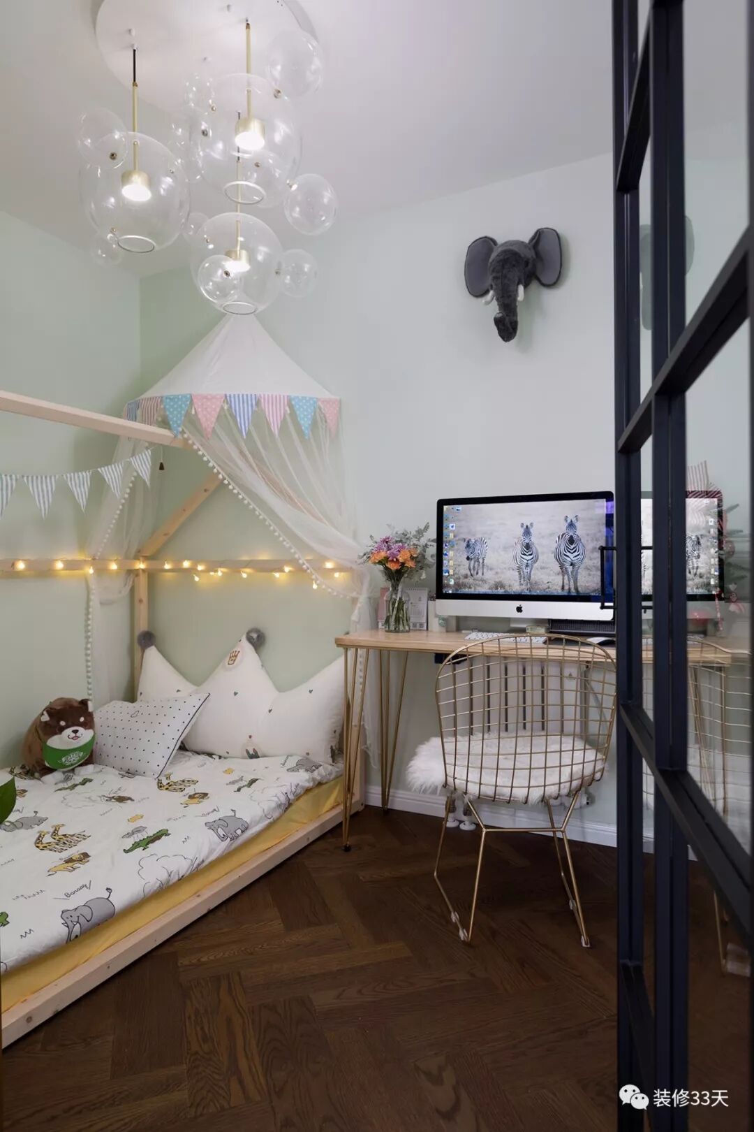 ▲ 客厅中间隔出一间儿童房,采用玻璃门提供采光,还安装新风和中央空调,女主还没怀孕就布置的爱心满满