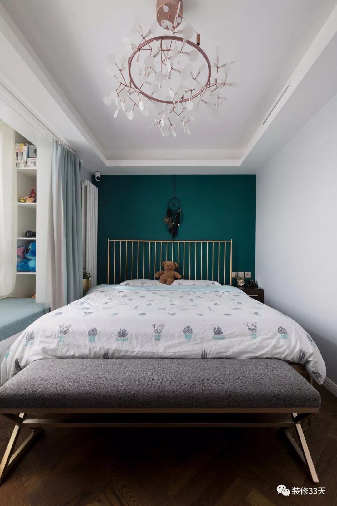 ▲ 主卧,人字铺木地板搭配一面深绿色床背景,金色床架与萤火虫吊灯,混搭北欧风元素