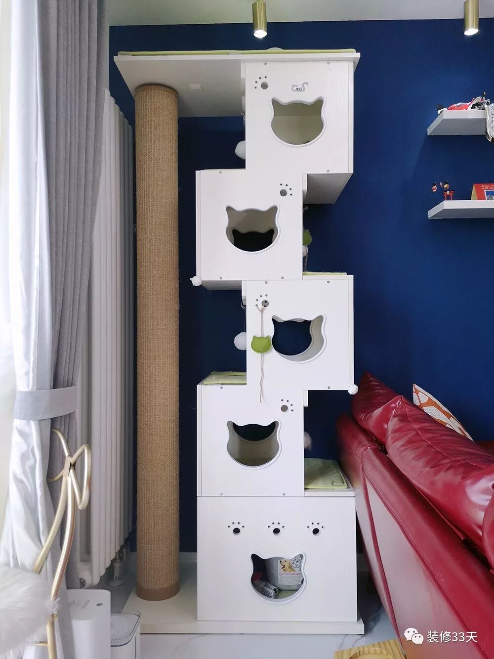▲ 客餐厅之间放置猫爬架,懒人养猫的各种神器一应俱全:自动猫沙盆、自动铲屎机、自动猫粮机和自动饮水机,解决猫的吃喝拉撒