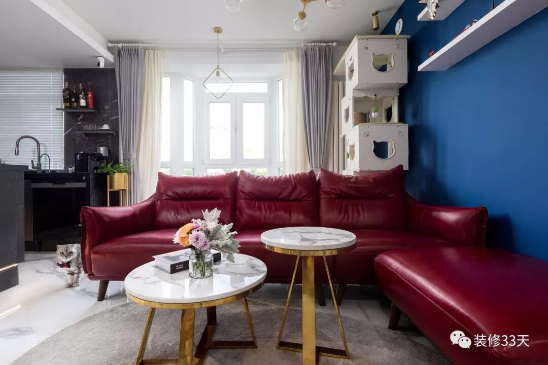 ▲ 客厅地面通铺浅色石纹地砖,与石纹茶几组呼应,酒红色沙发撞色蓝色墙面,用色彩平衡另一侧的全黑厨房